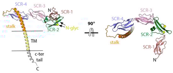The structure of the EV surface glycoprotein B5 obtained using AlphaFold2 []. Two orthogonal views of the model colored according to domains, as indicated. TM stands for transmembrane region. The location of the N-glycosylation sequences in the SCR-2 domain are indicated with yellow spheres and labelled in the left panel.
