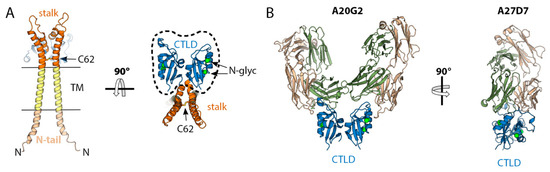 The structure of the EV surface glycoprotein A33. (A) structure of A33 obtained using AlphaFold2 [] colored according to domains, as indicated. TM stands for transmembrane region. The left and right panels are orthogonal views, as indicated. The region for which an experimental crystallographic model exists (PDB code: 3K7B, []) is indicated by a dashed line. (B) Crystallographic structures of the complexes formed by the CTLD domain and the mAbs A20G2 (PDB: 4LU5, []), and A27D7 (4M1G, []). The orientation of the CTLD domain in the left panel is the same as that shown in the right panel in (A), the orientation in the right panel is rotated to optimize the view.