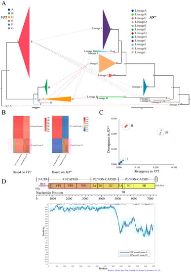 The enterovirus genome is a single-stranded, positive-sense RNA with approximately 7400 nucleotides containing a 5′-untranslated region (UTR), long open reading frame (ORF), and some enteroviruses also contain a short ORF and 3′-UTR []. The genome coding region first forms three polyprotein precursors (P1, P2, and P3); P1 is further divided into four structural proteins (VP4, VP2, VP3, and VP1) while P2 (2A, 2B, 2C) and P3 (3A, 3B, 3C, 3Dpol) form seven non-structural proteins. Serotypes of unknown enteroviruses can be determined using differences in VP1 sequences []. Furthermore, frequent recombination occurs in the 3Dpol of different serotypes of the same specie [], and recombination promotes viral evolution and the ability to adapt to the host and external environments, an important reason why some viruses cause disease outbreaks, despite being rarely noticed []. The 3Dpol-encoded RNA-dependent RNA polymerases (RdRps) are characterized by low fidelity, so misincorporations are common in viral replication. Recombination may be effective at reducing the accumulation of such errors [,], thereby enhancing virus survivability and indirectly leading to the emergence of more pathogenic strains.