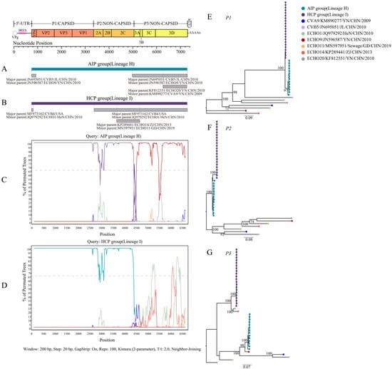 Recombination analysis of CVB4. Recombination analysis results based on sequences obtained after BLAST search are shown in Supplementary Figure S5. (A) Recombination analysis results of CVB4 isolated from the AIP group by RDP4. (B) Recombination analysis results of CVB4 isolated from HCP group by RDP4. (C) Recombination analysis results of CVB4 isolated from the AIP group by Simplot. Bootstrap values above 70% were considered to reflect the presence of recombination events (dashed positions). (D) Recombination analysis results of CVB4 isolated from the HCP group by Simplot. (E–G) ML trees constructed based on P1, P2, and P3 regions of the datasets consisting of CVB4 isolated from AIP and HCP groups, and their potential recombination sequences, respectively.