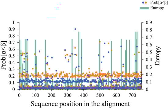 Entropy and pressure selection analysis. The entropy analysis results of the P3 region of CVB4 isolated from AIP and HCP groups are indicated by green bars, while sites with amino acid entropy values > 0.6 are considered highly variable. The orange and blue circles are the pressure selection results of each amino acid site in the P3 region of CVB4 isolated from AIP and HCP groups, respectively. Prob [α < β] is the posterior probability of positive selection at a site. Generally, posterior probabilities > 0.9 are strongly suggestive of positive selection.