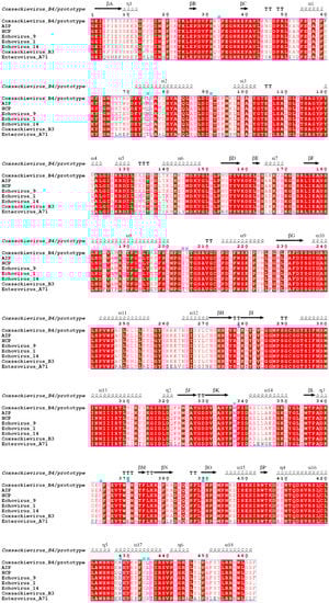 The sequence’s nucleotide and amino acid entropy values were analyzed using the Shannon entropy online analysis tool (http://www.hiv.lanl.gov/content/sequence/ENTROPY/entropy_one.html (accessed on 15 July 2022)). When the nucleotide and amino acid entropy values were >0.8 and >0.6, respectively, the site was considered highly variable []. The ratio of non-synonymous to synonymous substitutions (dN/dS) is an important indicator for evaluating the effect of selection pressure on coding genes. On the Datamonkey online analysis platform (http://www.datamonkey.org (accessed on 26 July 2022)), two methods, single likelihood ancestor counting (SLAC) and fast, unconstrained Bayesian approximation (FUBAR), were used to infer the individual amino acid sites subjected to positive selection [,], and p-values were determined using the method described in Table 1. The crystal structures of 3C (PDB code 5NFS) and 3Dpol (PDB code 4ZPD) of CVB3 were used as templates in the SWISS-MODEL online tool (https://swissmodel.expasy.org(accessed on 5 August 2022)) to construct a CVB4 structural model (not shown). Based on these models, multiple sequence alignment results containing secondary structures were generated using the ESPript (v3.0) online tool (https://espript.ibcp.fr/ESPript/ESPript/index.php (accessed on 5 August 2022)) to analyze amino acid differences [].