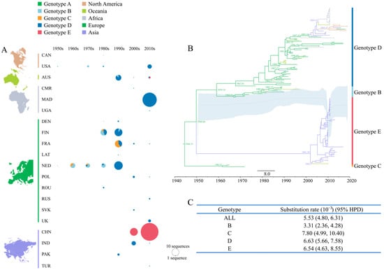 CVB4-related data from the GenBank database shows that in the past 70 years, CVB4 has been isolated in 20 countries on five continents (Figure 5A), which does not exclude the fact that some countries have underreported or not uploaded surveillance data to the GenBank database due to imperfect surveillance systems. The first two genotypes, B and C, were isolated from the Netherlands in the 1960s and then gradually became prevalent in European countries and remained prevalent for nearly 40 years. Genotype C’s prevalence was limited to Europe, while genotype B was prevalent in North America and Oceania in the late 1980s (Figure 5A,B), with both genotypes disappearing after the 21st century. Genotype D, which also originated in the Netherlands, began to spread to countries in Europe, North America, Africa, Asia, and Oceania in the 1980s and became the most widespread CVB4 genotype. In the 1990s, it replaced the B and C genotypes as a major prevalent CVB4 genotype and remains prevalent today. The E genotype emerged relatively late, was first isolated in China in 2007, was mostly limited to China with only infrequent cases in Australia, and is now a major currently prevalent genotype. The Bayesian skyline plot revealed that the CVB4 population size underwent multiple transformations before 2010 (Figure 5B) and experienced a rapid growth period afterward. By evolutionary rate, the substitution rates of genotypes C, D, and E of >6.50 × 10−3 substitutions/site/year, were much higher than that of genotype B at 3.31 × 10−3 substitutions/site/year (Figure 5C).