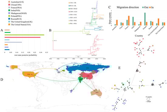 The root state posterior probabilities suggested that the D genotype originated from Poland after 2000 (Figure 6A), whereas China remained the origin of the E genotype. This is consistent with the MCC tree results (Figure 6B), where D and E genotypes evolved independently since 2000, with the D genotype introduced from Poland to France and from France to India in 2000–2005. It began to spread to several countries after 2005, leading to the widespread transmission of CVB4 in Madagascar. Genotype E was only sporadically disseminated from China to Australia during 2002–2010. The inference of the phylogeographic analysis of the migration direction of CVB4 D and E genotypes was consistent with the MCC results (Figure 6D), which were also supported by the BF and posterior probability values (Supplementary Table S8). The state counts results inferred by the Markov jumps method indicated that Poland and India were the major out-migration regions (Figure 6C), while France, Australia, and the United Kingdom were the major in-migration regions.