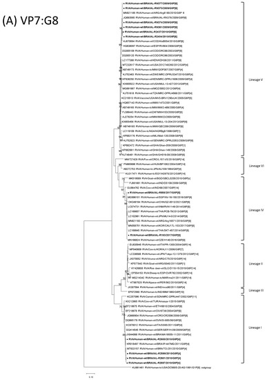 - Dulgheroff, A.C.; Silva, G.A.; Naveca, F.G.; Oliveira, A.G.; Domingues, A.L. Diversity of group A rotavirus genes detected in the Triângulo Mineiro region, Minas Gerais, Brazil. Braz. J. Microbiol. 2016, 47, 731–740. [Google Scholar] [CrossRef] [PubMed][Green Version]