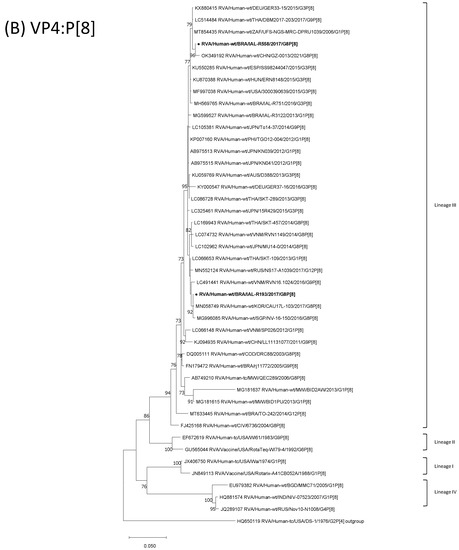- Gómez, M.M.; Volotão, E.M.; de Mendonça, M.C.; Tort, L.F.; da Silva, M.F.; Leite, J.P. Detection of uncommon rotavirus A strains P[8]G8 and P[4]G8 in the city of Rio de Janeiro, 2002. J. Med. Virol. 2010, 82, 1272–1276. [Google Scholar] [CrossRef]