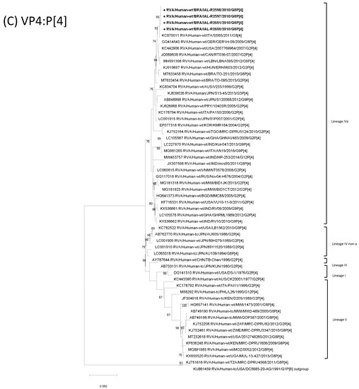 - Degiuseppe, J.I.; Stupka, J.A. Argentinean Rotavirus Surveillance Network. Emergence of unusual rotavirus G9P[4] and G8P[8] strains during post vaccination surveillance in Argentina, 2017–2018. Infect. Genet. Evol. 2021, 93, 104940. [Google Scholar] [CrossRef] [PubMed]