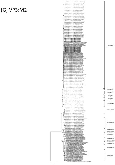- Gupta, S.; Gauhar, M.; Bubber, P.; Ray, P. Phylogenetic analysis of VP7 and VP4 genes of the most predominant human group A rotavirus G12 identified in children with acute gastroenteritis in Himachal Pradesh, India during 2013–2016. J. Med. Virol. 2021, 93, 6200–6209. [Google Scholar] [CrossRef]
