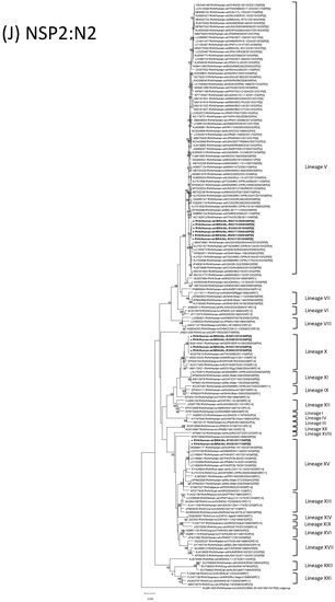 - Agbemabiese, C.A.; Nakagomi, T.; Damanka, S.A.; Dennis, F.E.; Lartey, B.L.; Armah, G.E.; Nakagomi, O. Sub-genotype phylogeny of the non-G, non-P genes of genotype 2 Rotavirus A strains. PLoS ONE 2019, 14, e0217422. [Google Scholar] [CrossRef]