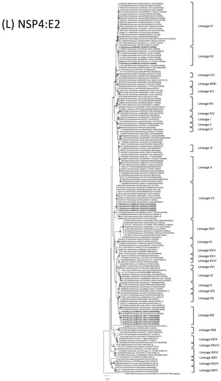 On the one hand, the VP2, VP3, VP6 and NSP4 phylogenetic analysis, strains IAL-R193 and IAL-R558 formed clusters with the Asian bovine-like G8P[8] strains with the DS-1-like backbone, but also with Asian equine-like G3P[8] DS-1-like strains and Asian emerging double-gene reassorted G1/G9P[8] DS-1-like RVA strains (nucleotide sequence identities of 98.4–99.8%, 99.3–100%, 99.7–100% and 98.8–99.5%, respectively) (Figure 1F–H,L). On the other hand, the NSP1 and NSP3 genes of strains IAL-R193 and IAL-558 formed clusters with Asian, European and American intergenogroup reassorted DS-1-like G1/G3/G9/G8P[8] strains (nucleotide sequence identities of 98.4–99.7% and 99.2–100%, respectively) (Figure 1I,K). Considering the NSP5 gene analysis in particular, the Brazilian RVA/Human-wt/BRA/IAL-R193/2017/G8P[8] strain exhibited a close genetic relationship to those of Asian, European and American intergenogroup reassorted DS-1-like G3/G9/G8P[8] strains (99–99.8% nt), while the RVA/Human-wt/BRA/IAL-R558/2017/G8P[8] strain displayed a genetic relationship with Asian and Australian G2P[4] strains besides the Asian, European and American intergenogroup reassorted DS-1-like G3/G9/G8P[8] strains (99.5–100% nt) (Figure 1M). As highlighted in the genotype lineage constellations data, a key observation was extracted from the phylogenetic analysis of the VP1 gene, in which the RVA/Human-wt/BRA/IAL-R193/2017/G8P[8] strain is closely related to the Asian bovine-like G8P[8] strains with the DS-1-like backbone and double-gene reassorted G9P[8] DS-1-like strains (99.3–99.8% nt), whereas RVA/Human-wt/BRA/IAL-R558/2017/G8P[8] strain could not be placed in any lineage previously proposed by Agbemabiese et al. [41] (Figure 1E).