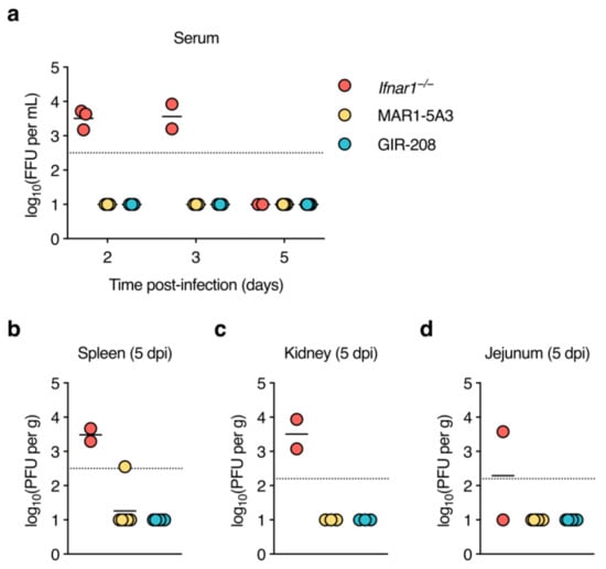After demonstrating asymptomatic D2Y98P infection in MAR1-5A3-treated mice, we next determined the kinetics of viraemia and viral dissemination. Adult mice were treated as before and inoculated subcutaneously with 106 PFU of D2Y98P. Sera were collected at 2, 3, and 5 dpi, organs (spleen, kidney, jejunum, and liver) were harvested at 5 dpi, and tested for the presence of infectious virus. Two out of four Ifnar1−/− mice had to be euthanised at 4 dpi because humane endpoint criteria were met. As before, gross pathological examination at necropsy demonstrated splenomegaly and liver lesions in all Ifnar1−/− mice. Interestingly, we also observed splenomegaly but no other gross pathological changes in mice treated with MAR1-5A3, whereas the organs of GIR-208-treated mice appeared normal. Ifnar1−/− mice had comparable levels of viraemia at 2 and 3 dpi, but virus was seemingly cleared from the circulation by 5 dpi (Figure 2a). No infectious virus was detected in the sera of mice treated with MAR1-5A3 or GIR-208 at any time point. Spleens and kidneys of the Ifnar1−/− mice contained similar viral titres (Figure 2b,c), while virus was only detectable in the jejunum of one of these animals (Figure 2d). For one out of six mice treated with MAR1-5A3, virus was found in the spleen, though this was barely above the limit of detection. No infectious virus was detected in the kidneys or jejunum of these animals. All organs harvested from GIR-208-treated mice tested negative for virus. Unfortunately, virus titrations could not be performed for liver homogenates as they were highly cytotoxic to BHK-21 cells. These results suggest that antibody-mediated blockade of type I IFN signalling is insufficient for the production of detectable levels of infectious D2Y98P in wild-type mice.