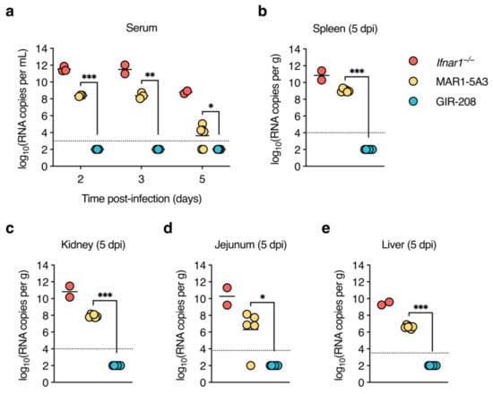 High levels of viral RNA are present in sera and organs of D2Y98P-infected adult wild-type mice treated with IFNAR1-blocking antibody. Same mouse experiment as in Figure 2. (a) Viral RNA in sera collected at 2, 3, and 5 dpi was quantified by RT-qPCR. (b–e) Viral RNA in organs harvested at 5 dpi was quantified by RT-qPCR. Results for spleen (b), kidney (c), jejunum (d), and liver (e) are shown. Each symbol represents one mouse. Short horizontal lines indicate means. Dotted horizontal lines indicate the limit of detection. Data below the limit of detection were assigned nominal values. *, p < 0.05; **, p < 0.01; ***, p < 0.001 (unpaired t-test with Welch’s correction).