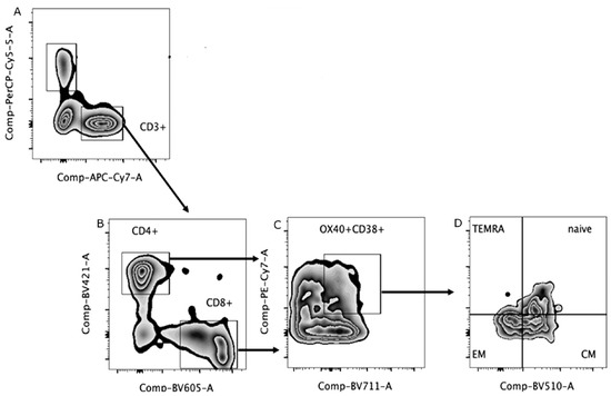 Gate strategy to set T lymphocytes by flow cytometry. (A) Gate strategy to set T (CD3+) from peripheral blood mononuclear cells. (B) Subsets of TCD4+/TCD8+ according CD3+ and CD4+ or CD8+ expression (C) Gating of activated TCD4+/TCD8+ (Ox40+ CD38+); (D) Percentage of TEMRA (CD45RA+CCR7-), naïve (CD45RA+CCR7+), EM (CD45RA-CCR7-) and CM (CD45RA-CCR7+) TCD4+/TCD8+.