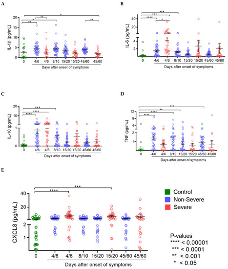 Cytokine detection: Comparing cytokine levels quantification in laboratory controls and patients in the 4/6-day collection after study admission, it was seen that non-severe COVID-19 cases showed an increase in IL1β, IL-6, IL-10 and TNF (Figure 3A–D). Severely ill patients had higher levels of the cytokines IL-6, IL-10 and CXCL8 in the first days of SARS-CoV-2 infection (Figure 2B,C,E) and, in contrast, lower levels of IL-1β and TNF (Figure 3A,D) than controls and non-severe patients. At the later time of collection, 45/60 days after admission, non-critical patients still had increased levels of IL-1β and TNF (Figure 3A,D).