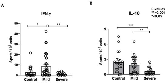 Percentage of cytokine secreting cells from severe and non-severe patients and no infected control group by FluoroSpot data: (A) IFN-γ; (B) IL10. p-values, *** <0.0001, ** <0.001 and * <0.05.