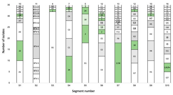 The identification of the serotype of circulating viruses is important from an epidemiological perspective and for vaccine antigen selection since the viral serotypes show varying levels of cross-neutralisation []. Since BTV contains a segmented genome, the reassortment of segments both within and between serotypes can occur []. The relative role of reassortment in the evolution of the virus has been investigated for BTV isolates from America, Europe, and India, which has indicated that reassortment occurs regularly between the segments of different co-circulating viral strains and serotypes [,,,]. An investigation of the frequency of genetic reassortment indicated that there was a bias in the segments that were reassorted and that certain genome segments tended to be reassort together [,]. Additionally, genomic sequence analysis indicated that reassortment was followed by a high frequency of amino acid changes in the reassorted genome segments, indicative of possible adaptive evolutionary changes in the reassorted viruses []. Besides reassortment, BTV has also been demonstrated to evolve through genetic drift and genetic recombination [,]. Cumulatively, these processes result in high plasticity in the genome of BTV, which is thought to be the main driver for the emergence of strains that demonstrate different phenotypic properties [,,,].