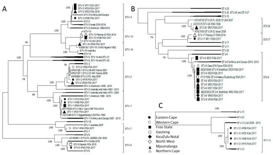Analyses of Segment-4 indicated the isolates from RSA, Africa, the Middle East, and Europe cluster into a single major group, Group 1, consisting of seven sub-clusters (Figure 6A). Two of the sub-clusters are associated, respectively with BTV-22 and BTV-24, suggesting genetic drift from a recent common ancestor (Figure 6). Samples originating from the FS and MP provinces clustered into four sub-clusters each, whilst samples from the EC were divided into two sub-clusters (Figure 6). Three samples from the EC (BTV-1_VR06_RSA_2017, BTV-1_VR13_RSA_2017, and BTV-17_VR17_RSA_2017), as well as sample BTV-4_VR01_RSA_2017 from Rosendal in the FS, which clusters together in Segment-1, -3, -5, -7, -8, and -9, were subdivided into clusters C3 and C1, indicating possible reassortment of Segment-4 in sample BTV-1_VR13_RSA_2017 (Figure 6A). These four isolates had another possible reassortment event in Segment-10 when the sample BTV-17_VR17_RSA_2017 clusters with the reference strains BTV-1, 6, 9 and 13, whilst the other three isolates form Cluster I3. Additionally, these four isolates were examples of possible reassortment events involving the antigenic determinants encoded by Segment-2 and Segment-6, with two isolates belonging to BTV-1, one to BTV-4, and one to BTV-17 (Figure 3 and Figure 11).