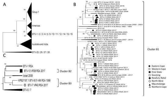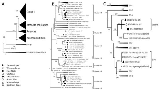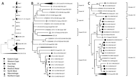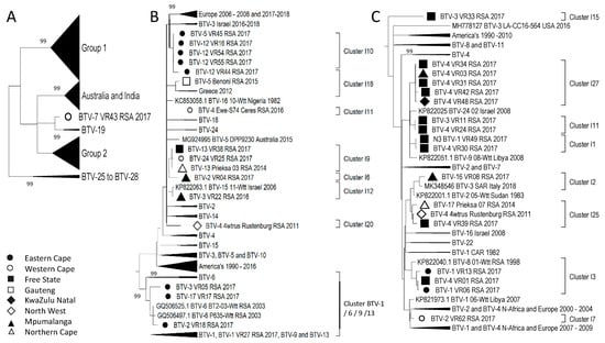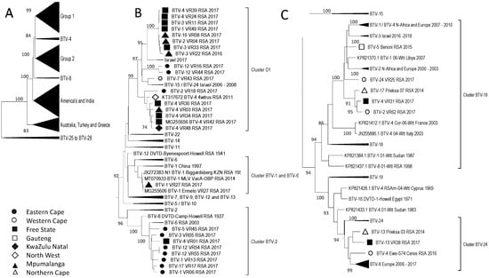 Phylogenetic analysis of Segment-10 sequences using maximum likelihood analysis. (A) A phylogenetic tree containing all the sequences grouping the isolates from RSA into two large groups, while sample BTV-7_VR43_RSA_2017 forms a monophyletic cluster called Cluster I8. (B) Subtree representing Group 1. (C) Subtree of isolates in Group 2. Isolates from RSA are indicated based on the province they originated from (key provided in the figure).