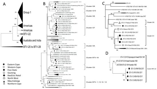 Phylogenetic analysis of Segment-8 sequences using maximum likelihood analysis. Samples from RSA belonged to either Group 1 or Cluster BTV-22. (A) A subtree from Group 1 containing the majority of the RSA samples. (B) The second subtree of Group 1. (C) Subtree containing isolates in Cluster BTV-22. (D) Subtree containing isolates clustering with BTV-22 reference sequence. Isolates from RSA are indicated based on the province they originated from (key provided in the figure).