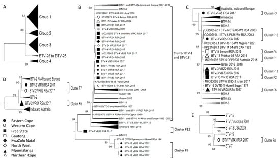Phylogenetic analysis of Segment-7 sequences using maximum likelihood analysis. (A) A phylogenetic tree containing all the sequences grouped the isolates of BTV-1 to BTV-24 into four large groups. (B) Subtree representing Group 1. (C). Subtree of isolates in Group 3. (D) Subtree of isolates in Group 2. (E) Subtree of isolates in Group 4. Isolates from RSA are indicated based on the province they originated from (key provided in the figure).