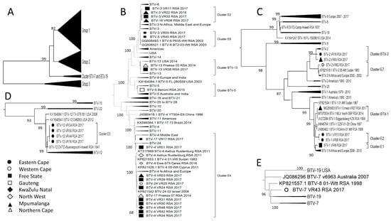 Phylogenetic analysis of Segment-6 sequences using maximum likelihood analysis. (A) A phylogenetic tree containing all the sequences grouping the isolates from RSA into each of the four large groups. (B) Subtree representing Group 1. (C) Subtree of isolates in Group 2. (D) Subtree of isolates in Group 3. (E) Subtrees of isolates in clusters BTV-7 and BTV-19. Isolates from RSA are indicated based on the province they originated from (key provided in the figure).