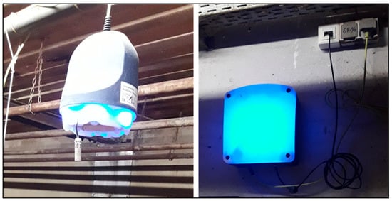 The commercially available AI device (SoundTalks® NV, Leuven, Belgium) performed continuous and automated measurements of coughs and was able to distinguish between a pigs’ cough and other environmental noises in the barn. It compared the previous day’s coughing level with the current one and calculated a numerical score (respiratory health status; ReHS) with values ranging from 0 (worst case) to 100 (best case). The alerts could be recognized through LED lights on the monitor and through the website. A normal ReHS, which ranges from 60 to 100, was represented by a green signal. Yellow and red alerts indicated a potential and a high risk of a respiratory problem and were equivalent to 40–59 and 0–39 ReHS, respectively. Two SoundTalks® boxes (M1, M2) were installed in the alleyway of the barn. Blinding of the investigator was ensured by setting the LEDs of the monitors to “science mode” (blue LED) over the entire study period (Figure 1). The ReHS was obtained daily (24/7) over the entire study period. The total ReHS displayed the lowest score obtained from one of the two monitors.