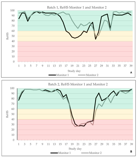 ReHS of batch 1 (A) and batch 2 (B) obtained by monitor 1 and monitor 2 over the entire study period. Green indicated a normal ReHS, which ranges from 60 to 100. Yellow indicated a potential risk of a respiratory problem, equivalent to 40–59 ReHS and red a high risk of a respiratory problem, equivalent to 0–39 ReHS.