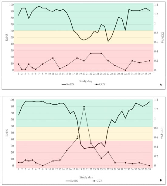 Total ReHS and CCS of batch 1 (A) and batch 2 (B) for the observational period of 39 days. Green indicated a normal ReHS, which ranges from 60 to 100. Yellow indicated a potential risk of a respiratory problem, equivalent to 40–59 ReHS and red a high risk of a respiratory problem, equivalent to 0–39 ReHS.