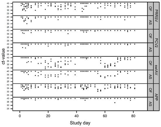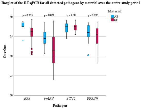 Briefly, all of the targeted pathogens, with the exception of M. hyopneumoniae, could be detected using PCR in both batches. Significant differences concerning the frequency of detection between OFs and AS could be observed for PRRSV and A. pleuropneumoniae in both batches (Table 2). In detail, the odds of detecting PRRSV in OFs were 3.72 times higher (95% CI: 1.96–7.08, p < 0.001) compared to AS. Moreover, there were 24.89 higher odds (95% CI: 10.17–60.92, p < 0.001) of finding A. pleuropneumoniae in OFs using PCR compared to AS. In addition, Cohen’s kappa was calculated to evaluate the agreement between OFs and AS to assign the study population as pathogen-positive or negative for each sample day. Only for swIAV a significant agreement (p < 0.001) between OFs and AS with a moderate kappa (0.578) could be observed. For all the other pathogens, no significant agreement could be detected. The median Ct-values of the PCR for swIAV-, PRRSV-, PCV2-, and A. pleuropneumoniae-positive OFs and AS are shown using boxplots (Figure 5). RNA or DNA loads of A. pleuropneumoniae and swIAV were significantly higher in OFs compared to AS (Figure 5), respectively.