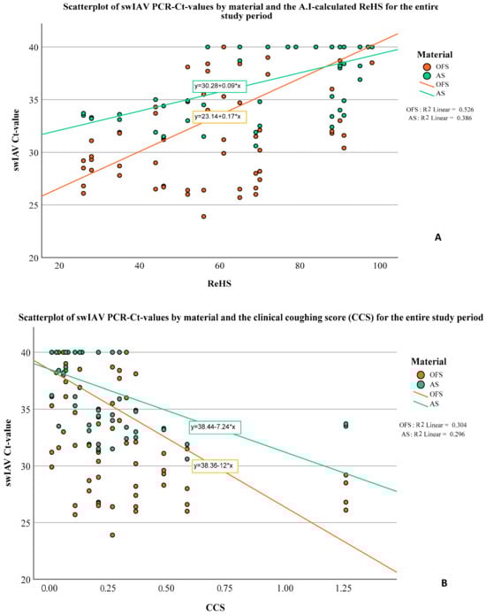 To evaluate potential relationships between the extent of coughing (expressed by ReHS or CCS) and the viral or bacterial loads (expressed by Ct-values) in OFs or AS, bivariate correlations (Spearman’s rho) were calculated. A significant correlation was observed between the Ct-values of the swIAV PCR results and the ReHS (Spearman’s rho: AS: 0.630, p < 0.001; OFs: 0.693, p < 0.001) and CCS (Spearman’s  rho: AS: −0.542, p < 0.001, OFs: −0.535, p < 0.001) for the entire study period. Figure 7 depict the Ct-values of swIAV for OFs and AS in correlation with the ReHS (Figure 7A) or CCS (Figure 7B), including the regression equation for swIAV Ct-values depending on the used sampling material.