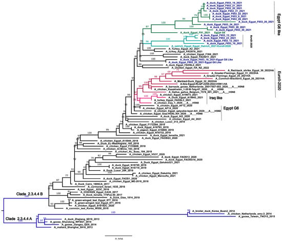 Since 2016, H5N8 viruses in clade 2.3.4.4.b have been spreading across Egypt [,,,,,,,,,,,,,,,,,,,,,,,,,,,,,,,,,,,,,,,,,,,,,,,,,,,,,,,,,,,,,]. Previous reports indicated that the major genotypes of H5N8 avian influenza viruses (IAVs) in Egypt can be divided into six distinct genotypes [,]. Recent studies have also reported the introduction of the EuroII-2020 subclade, particularly found in ostriches [].