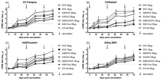 Time course of the total FMDV antibodies measured by LPBE. Seven different FMD vaccines were administered to groups of cattle (n = 3), as detailed in Table 1. Animals received three vaccinations at 0, 28, and 56 days (indicated by vertical arrows). Serum samples were taken at different times post-primary vaccination (dpv) and studied for total anti-FMDV antibodies using LPBE against the 01/Campos (A), C3/Indaial (B), A24/Cruzeiro (C), and A/Arg/2001 (D) FMDV strains. Each line depicts the mean antibody titers registered for each experimental group at the different time points + SD. Dotted lines in each chart indicate EPP75 corresponding to that strain by LPBE.