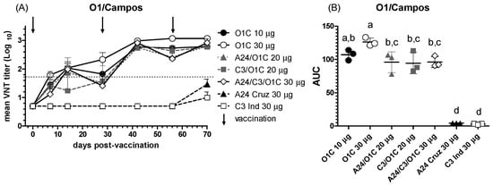 NAb responses against the O1/Campos strain. (A) Time course of the nAb titers in each experimental group; each line depicts mean antibody titers registered for each experimental group at the different time points. The dotted line denotes the EPP75 corresponding to the O1/Campos strain by VNT. Vaccination times are indicated by vertical arrows. (B) Overall neutralizing performance expressed as the mean AUC ± SD for each experimental group. Letters in the chart indicate significant differences between groups (1-way ANOVA p < 0.05; a > c, p < 0.01; a > d: p < 0.0001; b > d: p < 0.0001).