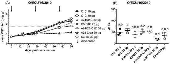 Evidence of nAb responses against the South American heterologous strain O/ECU/46/2010 was only observed after the second vaccination for all the formulations, except for the group immunized with the serotype A monovalent vaccine (A24 30 μg), which remained negative for strain-specific nAb throughout the experiment. Despite their phylogenetic proximity to the O1/Campos strain [], their antigenic differences resulted in a significant decrease in the neutralizing activity for all experimental vaccines compared to their performance against the homologous strain. The serological results presented here are in line with previous in vivo challenge experiments, which showed that a 20 μg monovalent O1/Campos vaccine only provided 6.25% of protection against the O/ECU/46/2010 strain challenge in PPG tests after a single vaccination and 18.75% after revaccination []. As with the O1/Campos strain, revaccination significantly increased the neutralizing activity against the O/ECU/46/2010 strain for most of the vaccine groups, including the C3I 30 μg group, especially between the first and second vaccination, though to a lesser extent. However, the highest mean neutralizing titers achieved with vaccines containing the O1/Campos strain were nearly ten times lower than those observed in the neutralization tests with the homologous virus. Additionally, consistent with the VNT results obtained against the O1/Campos strain, the inclusion of heterologous strains did not enhance the performance of the lower payload monovalent O1/Campos vaccine (10 μg/dose). Two weeks after the third vaccination (70 dpv), all these vaccines reached similar titers, with significant differences observed only against the monovalent A24/Cruzeiro vaccine (30 μg/dose).