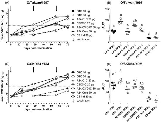 NAb responses against the O/Taiwan/1997 and O/SKR/84/YDM strains. (A,C) Time course of nAb titers in each experimental group. Each line depicts mean antibody titers registered for each experimental group at the different time points against the O/Taiwan/1997 (A) or O/SKR/84/YDM (C) strains. Dotted lines denote the EPP75 corresponding to the O1/Campos strain by VNT. Vaccination times are indicated by vertical arrows. (B,D) Overall neutralizing performance expressed as the mean AUC ± SD for each experimental group against the O/Taiwan/1997 (B) or O/SKR/84/YDM (D) strains. Letters in the chart indicate significant differences between groups (1-way ANOVA p < 0.05; a > c, p < 0.0001; a > d, p < 0.0001; b > c, p < 0.001; c > d: p < 0.01; e > g, 0.001; e > h, 0.0001; g > h, 0.001).