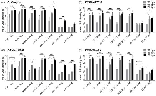 The progression of mean nAb titers induced by each experimental vaccine against the homologous and heterologous serotype O FMDV strains was analyzed two and four weeks after the first vaccination (14 dpv and 28 dpv, respectively), four weeks after the second vaccination (56 dpv), and two weeks after the third vaccination (70 dpv).