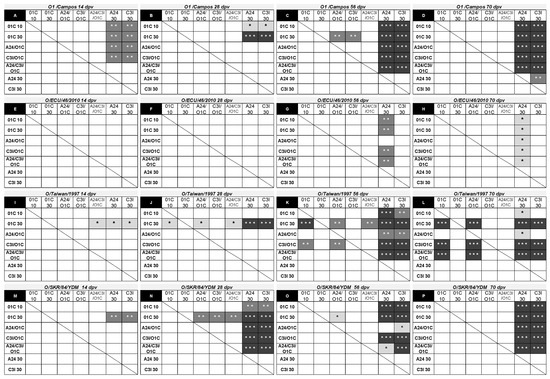 Neutralizing responses against the O/SKR/84/YDM strain at 14 dpv were only significantly higher in the O1C 30 μg group compared to its counterparts from another serotypes (A24 30 μg and C3I 30 μg) (Figure 6M). As observed for the other Asian strain, two weeks later (28 dpv), these differences increased their significance, were extended to the rest of the experimental groups, and were also detected for all animals immunized with bivalent and trivalent vaccines against the A24 30 μg and C3I 30 μg groups (Figure 6N). After revaccination (56 dpv), most of the significant differences against the A24 30 μg and C3I 30 μg groups remained, in some cases increasing their significance, and the nAb levels induced in the O1C 30 μg group were reached by the O1C 10 μg, C3I/O1C 20 μg, and A24/C3/O1C 30 μg groups (Figure 6O). After the third vaccination (70 dpv), all vaccines containing the O1/Campos strain induced similar nAb titers among them and were significantly higher than those observed for the A24 30 μg and C3I 30 μg groups, resembling the results observed against the homologous FMDV strain (Figure 6P,D).