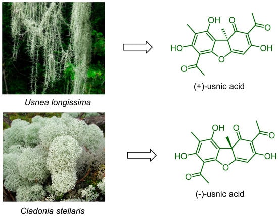 Structure of (+)-and (−)-usnic acid and their natural sources. The images are taken from [] with permission.