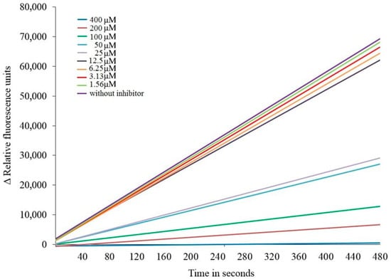 The rate of the enzymatic reaction was determined from the kinetic fluorescent curves via calculation of the change in fluorescence per unit time at different concentrations of the substrate. The accompanying MARS data analysis software 4.2 (BMG Labtech, Germany) were employed to calculate IC50, Km, and Vmax. Based on the obtained values of Km and Vmax, the number of enzyme turnovers (kcat = Vmax/[E]) and the enzyme’s catalytic efficiency (kcat/Km) were computed, which allowed us to evaluate the effectiveness of suppression of the kinetic reaction by a potential inhibitor.