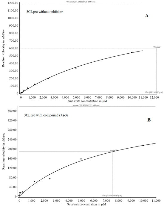 The dependence of the initial rate of substrate cleavage by SARS-CoV-2 3CLpro without (A) or with a potential inhibitor (+)-3e (B). Each data point are an average of at least three independent experiments; the values are presented as the mean ± SE.