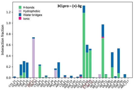 The compound (+)-3g was found to contact a large number of amino acid residues. In this context, the hydrophobic contact with His41 was detectable for more than 70% of the total simulation time, and a hydrogen bridge with Cys145 was registered for >50%. A hydrogen bridge with Gly143 was detectable for more than 120% of the simulation time. This figure indicates that atoms of (+)-3g formed more than one hydrogen bridge with Gly143 throughout the simulation (Figure 5). Hydrogen bonding with Glu166 atoms was observed during 70% of the simulation time. In addition, for ~5% of the time, (+)-3g atoms engaged in ionic interactions (salt bridges) with Glu166 atoms.