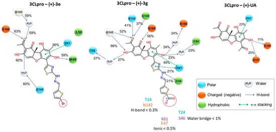 A summary of contacts recorded during molecular dynamics simulations. For complexes 3CLpro–(+)-3e and 3CLpro–(+)-3g, contacts are shown that were detectable for more than 20% of the simulation time for the 3CLpro–(+)-1 complex, they were present for more than 10% of the simulation time. Various substituents are highlighted in red.