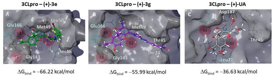 Molecular modelling study: Positioning of the studied ligands (+)-3e (A), (+)-3g (B) and (+)-UA (C), respectively, in the active binding site of subunit 3CLpro of the main protease. Letter designations S1–S3 correspond to significant cavities in the catalytic binding site.