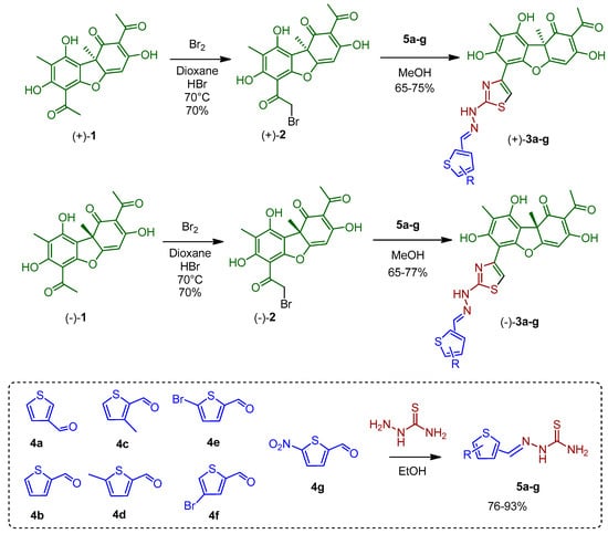 Compounds (+)-3a–g and (−)-3a–g were synthesized by a method developed elsewhere []. Thiosemicarbazones 5a–g were obtained through the reaction of corresponding thiophene aldehydes 4a–g with thiosemicarbazide in ethanol with reflux (Scheme 1). The formed precipitate was filtered off, washed with water, and then air dried. Thiosemicarbazones 4a–g were obtained with yields ranging from 76% to 93%. Bromo-substituted derivatives (+)-2 and (−)-2 were synthesized by a reaction of usnic acid with bromine in dioxane. Derivatives of usnic acid containing hydrazonothiazole moieties (+)-3a–g and (−)-3a–g were synthesized via the reaction of bromo-substituted derivatives (+)-2 and (−)-2 with thiosemicarbazones 5a–g in methanol. The precipitate was filtered off, dissolved in methylene chloride, and washed with a sodium bicarbonate solution, and the organic phase was evaporated. Thus, usnic acid derivatives (+)-3a–g and (−)-3a–g were obtained with yields at the final step ranging from 65% to 78%.