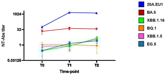 As shown in Figure 1, after tixagevimab/cilgavimab injection, we observed a significant increase in NT90-Abs reaching the peak after 14 days (T1) against 20A.EU1 (640, IQR 320–640, p) and BA.5 (20, IQR 10–20). The titer was roughly maintained after 30 days (T2). However, the NT90-Abs titer remained <10 against BQ.1, XBB.1.5, XBB.1.16, and EG.5 VOCs without differences compared to the pre-injection value.