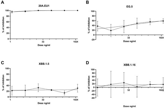 Dose-response inhibition test of tixagevimab/cilgavimab (1.2-1250 ng/mL) against 20A.EU1 (A), EG.5 (B), XBB.1.5 (C), and XBB.1.16 (D) strains of SARS-CoV-2 in Vero E6 cells (MOI 0.002). After 48 h of incubation on 96-well plates, supernatant titers were determined with plaque assay. Effective concentrations (EC50 and EC90) were calculated with four-parameter variable slope regression modeling. The data are presented as % of inhibition.