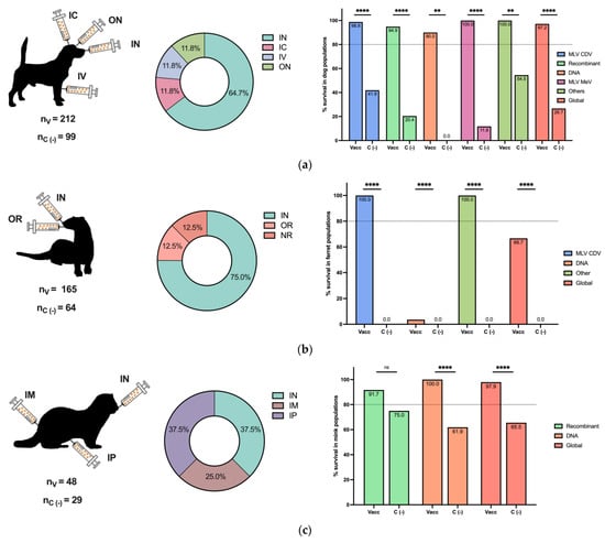 Postimmunization CDV challenge in different animal populations. The numbers of included vaccinated (nV) and negative vaccination control (nc (−)) animals of all challenged species are reported. The inoculation routes are shown, as well as the percentage of survival based on the vaccine type for (a) dog populations, (b) ferret populations, (c) mink populations, and (d) mouse populations. (e) Other populations, such as foxes, raccoons, Siberian polecats, and hybrid ferrets WITH Siberian polecats, are described. Other vaccines included MLV MeV, inactivated CDV, ISCOMs, and purified H and F CDV proteins in dogs; chimeric MeV-expressing CDV antigens in ferrets; and peptide-based vaccines in mice. IN: intranasal, IC: intracranial, SC: subcutaneous, IP: intraperitoneal, IM: intramuscular, ON: oculonasal, IV: intravenous, OR: oral, ID: intradermal, IDU: intraduodenal, NR: not reported. Z test for the difference in proportions with ** p < 0.01, **** p < 0.0001 and ns: not significance.