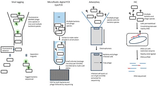 Some of these methods are more effective when the phage or host bacteria can be cultured and then used as “bait” to attract their partner. Viral tagging, for example, was first used to quantify hosts of particular viruses in mixtures of bacteria []. In contrast, Unterer and colleagues [] used FACS or microfluidic droplets to separate infected cells from uninfected and measure some phage growth dynamics. While they used known phages and hosts to demonstrate single infected cell isolation, this method could be used to capture uncultivated phages from an environmental sample. Other methods, such as microfluidic digital PCR or EpicPCR, can be used on uncultured hosts and phages. Both phage and bacteria need to be somewhat related to known species to create degenerate PCR primers that can be used to identify the host via 16S gene targeting and the phage via a phage marker gene.