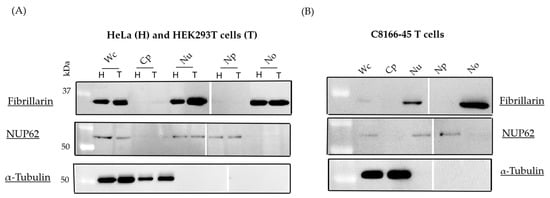 Efficiency of the nucleolar extraction method. Nucleoli were isolated from HeLa (H) and HEK293T (T) cells (A) and C8166-45 T cells (B). Proteins from subcellular fractions were separated by 12% SDS-PAGE and probed with anti-α-tubulin (cytoplasmic), anti-NUP62 (nucleoplasmic), and anti-fibrillarin (nucleolar) antibodies. Each lane was loaded with a fraction sample derived from the same number of cells. These results are representative of three independent experiments. Wc, whole cell; Cp, cytoplasm; Nu, nuclei; Np, nucleoplasm; No, nucleoli.