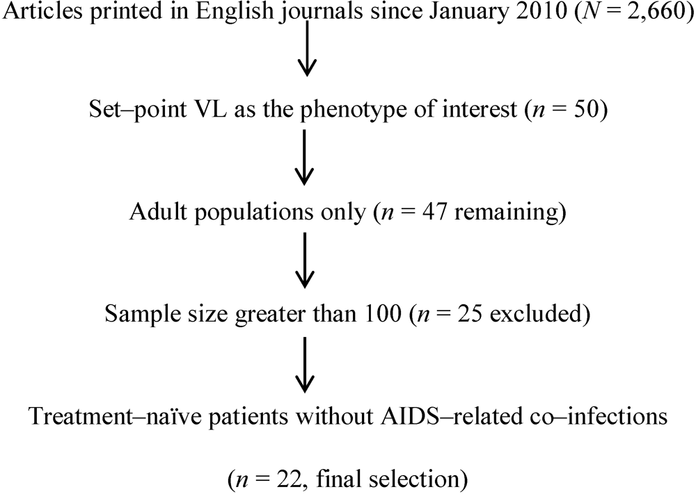 HIV-1 VL was, in one way or another, a subject in over 2,600 articles published since January 2010 (Figure 1). Our review here intends to highlight recent population-based research on host and viral correlates of HIV-1 VL set-point or its equivalent. For clarity and fair comparisons, studies assessing the relationship between host and/or viral factors on early set-point VL were selected according to two phenotypes, i.e.; set-point and chronic VLs as continuous or categorical endpoints. In addition, it was necessary to exclude studies dealing with children or youth (rare) or with small sample sizes (<100 HAART-naïve subjects). In the end, a total of 22 original research articles remained after four rounds of selection (Figure 1). Interpretation of these recent studies is relatively straightforward when supporting evidence from earlier reports is available.